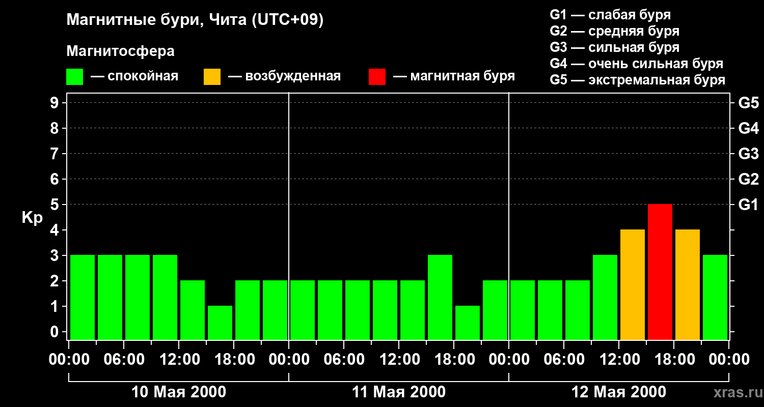 Изменения геомагнитного индекса Kp с 10 по 12 мая 2000 года для средних широт