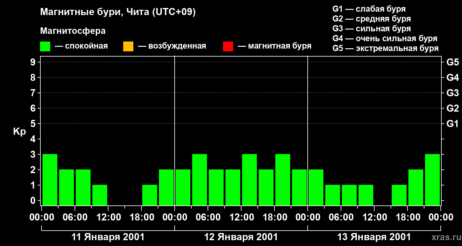 Изменения геомагнитного индекса Kp с 11 по 13 января 2001 года для средних широт