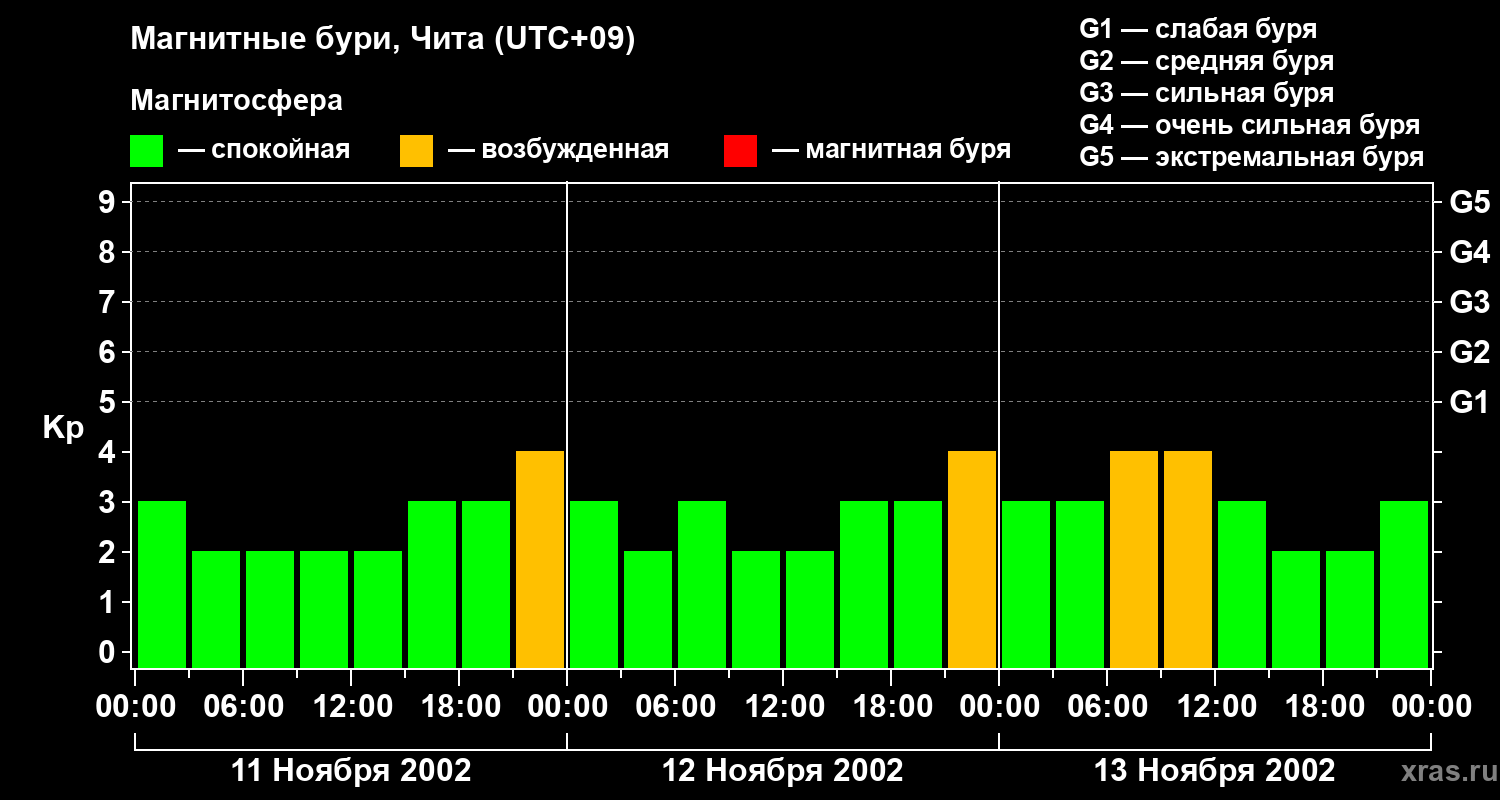 Изменения геомагнитного индекса Kp с 11 по 13 ноября 2002 года для средних широт