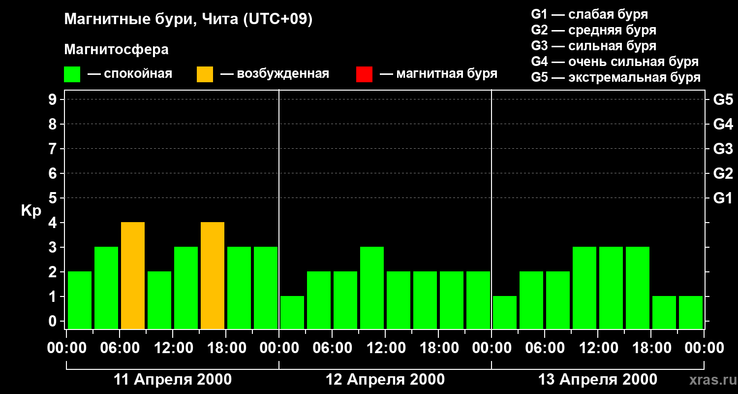 Изменения геомагнитного индекса Kp с 11 по 13 апреля 2000 года для средних широт