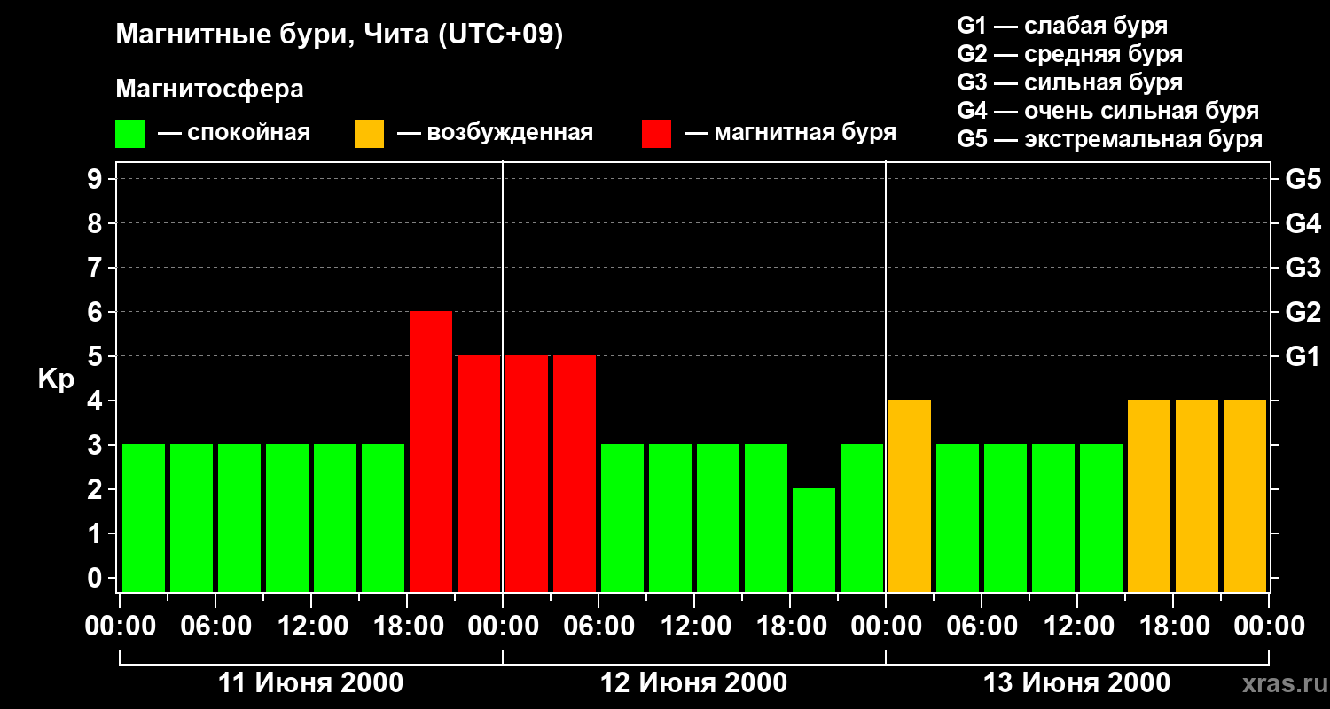Изменения геомагнитного индекса Kp с 11 по 13 июня 2000 года для средних широт