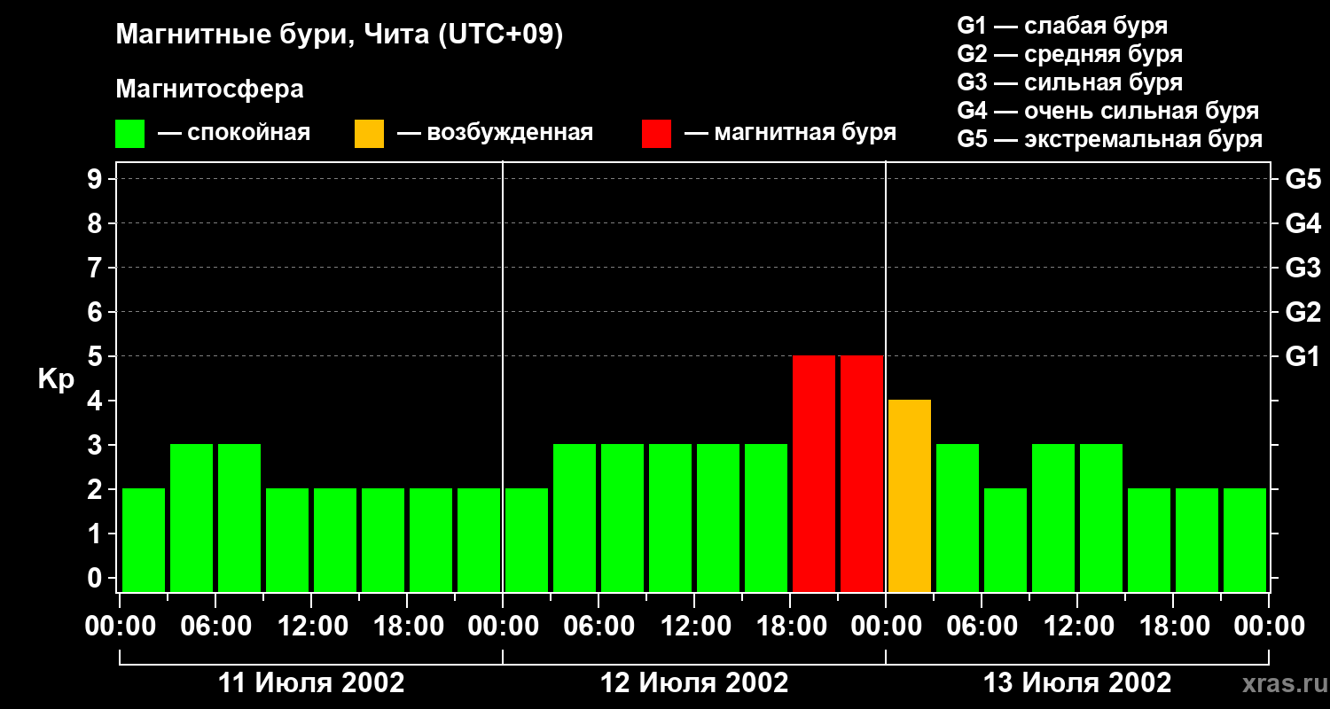 Изменения геомагнитного индекса Kp с 11 по 13 июля 2002 года для средних широт