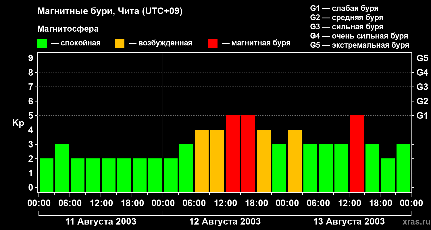 Изменения геомагнитного индекса Kp с 11 по 13 августа 2003 года для средних широт