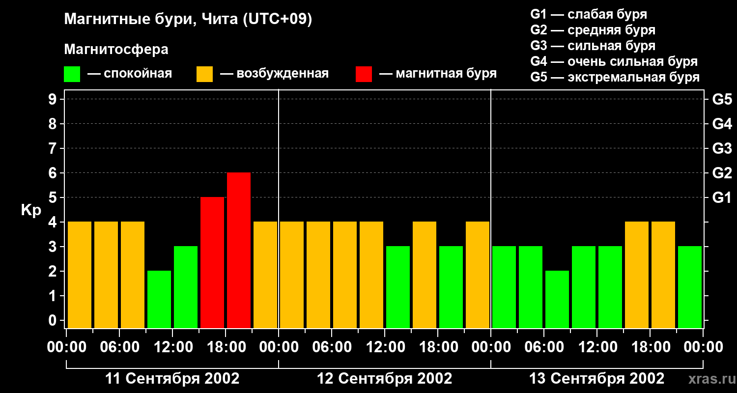 Изменения геомагнитного индекса Kp с 11 по 13 сентября 2002 года для средних широт