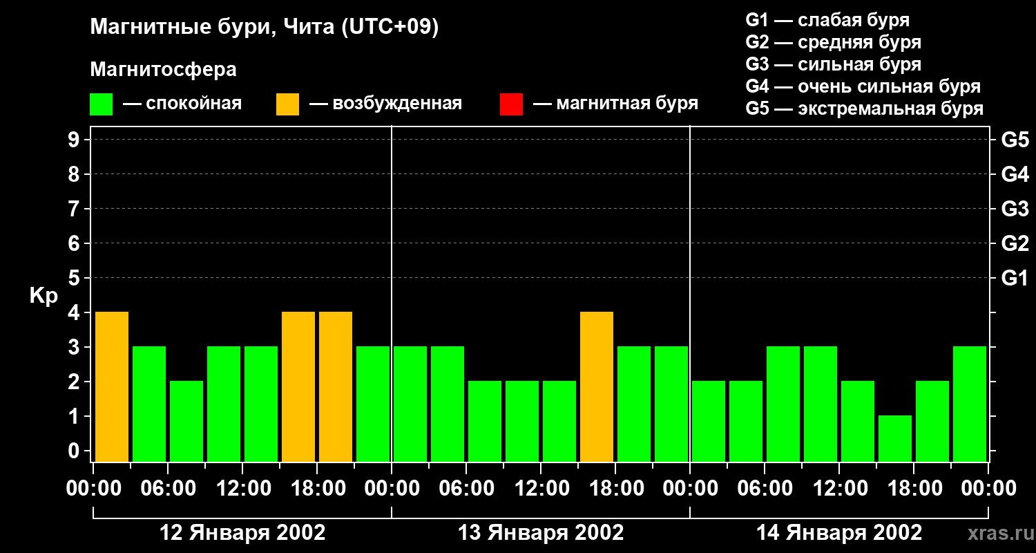 Изменения геомагнитного индекса Kp с 12 по 14 января 2002 года для средних широт