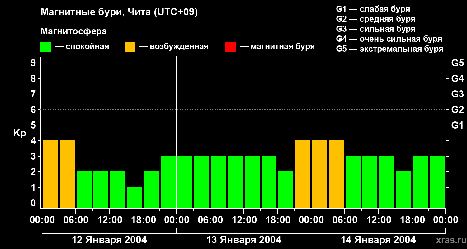 Изменения геомагнитного индекса Kp с 12 по 14 января 2004 года для средних широт