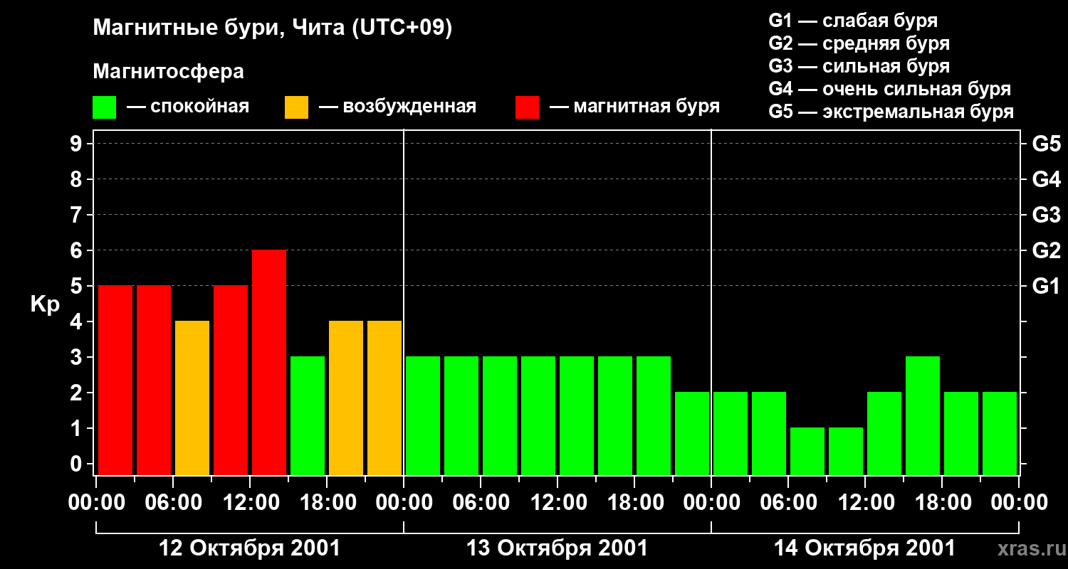 Изменения геомагнитного индекса Kp с 12 по 14 октября 2001 года для средних широт