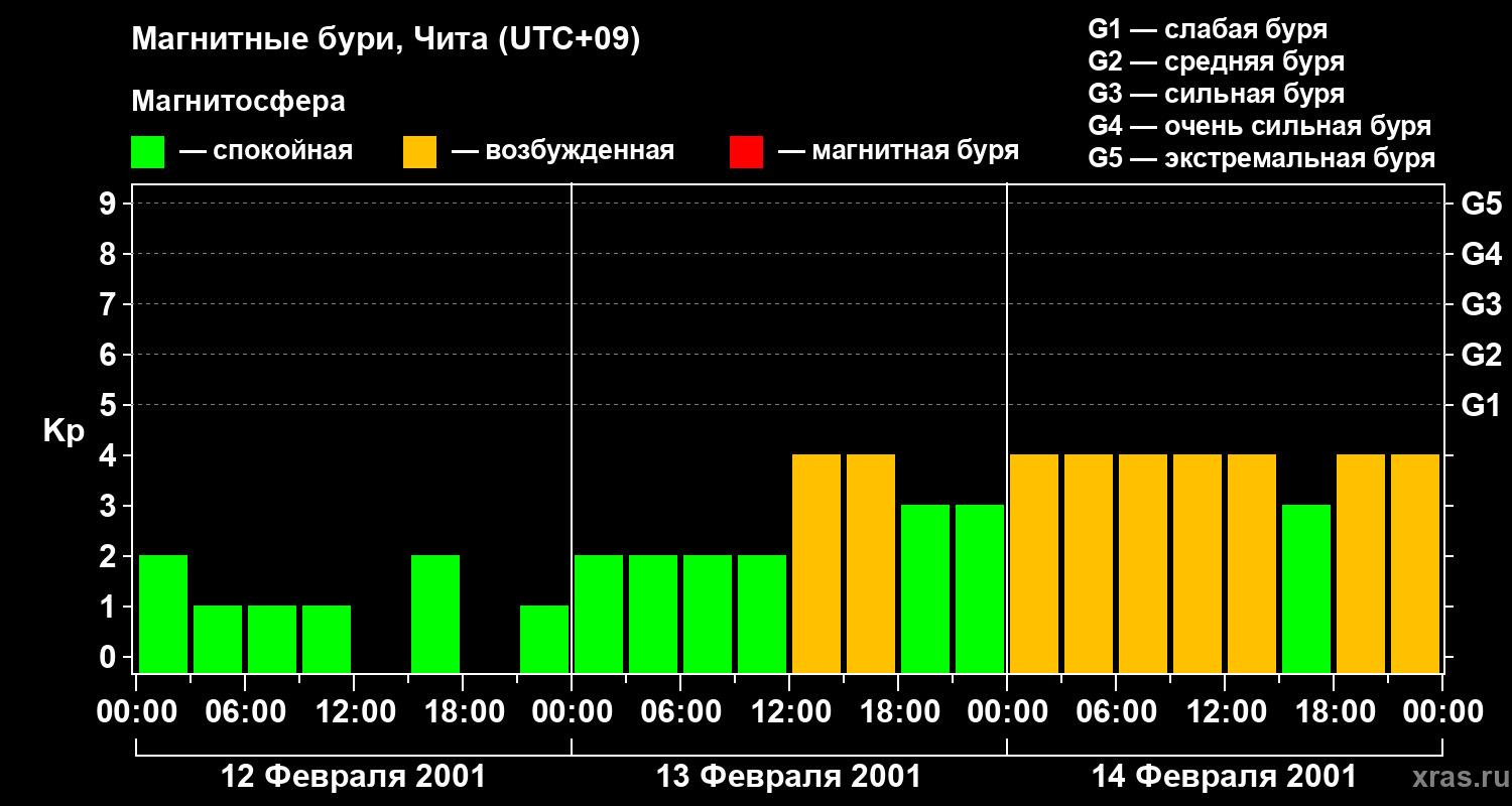 Изменения геомагнитного индекса Kp с 12 по 14 февраля 2001 года для средних широт