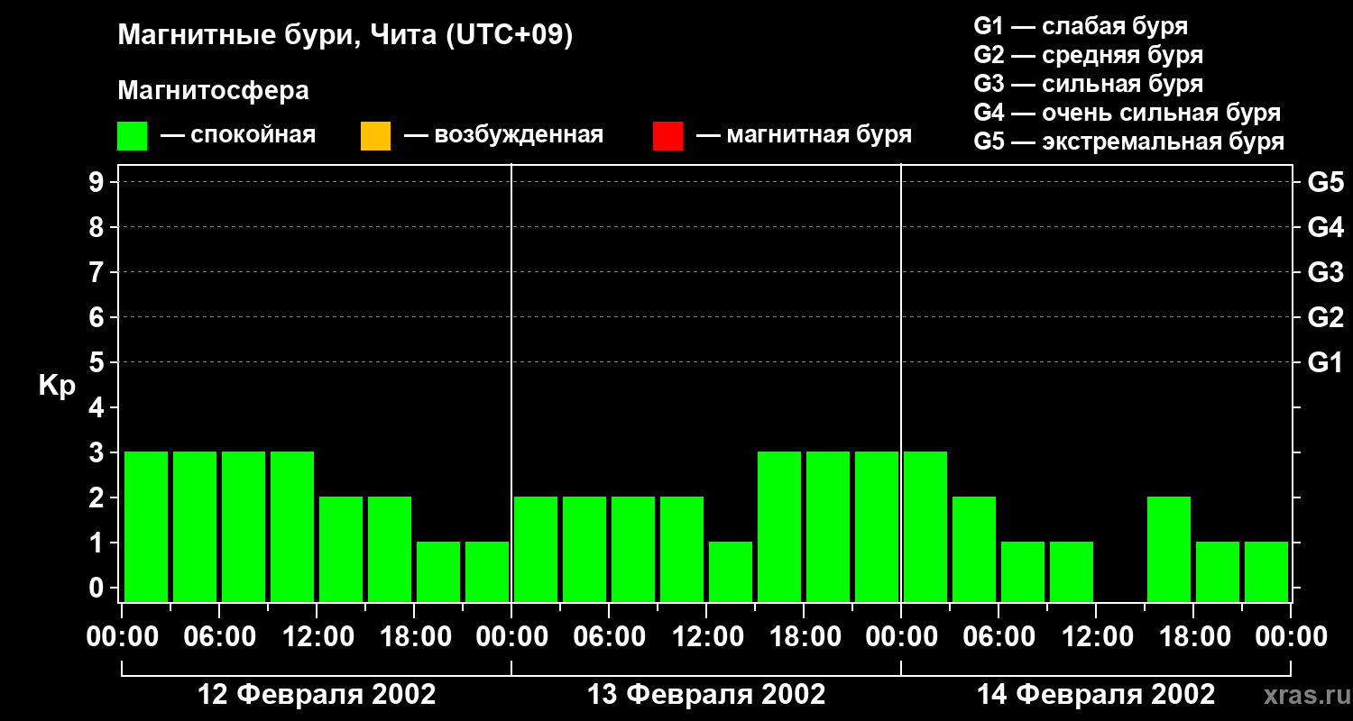 Изменения геомагнитного индекса Kp с 12 по 14 февраля 2002 года для средних широт