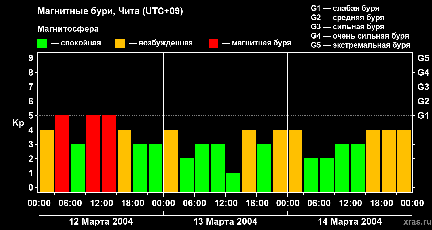 Изменения геомагнитного индекса Kp с 12 по 14 марта 2004 года для средних широт