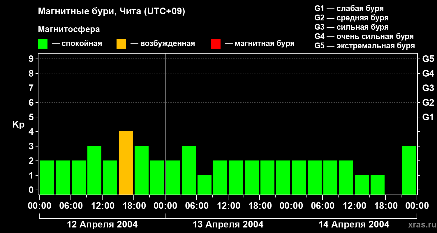 Изменения геомагнитного индекса Kp с 12 по 14 апреля 2004 года для средних широт