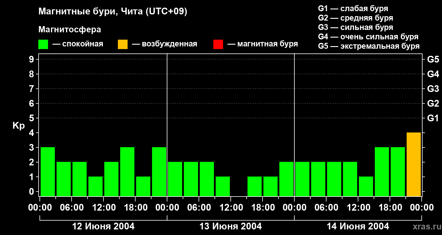 Изменения геомагнитного индекса Kp с 12 по 14 июня 2004 года для средних широт