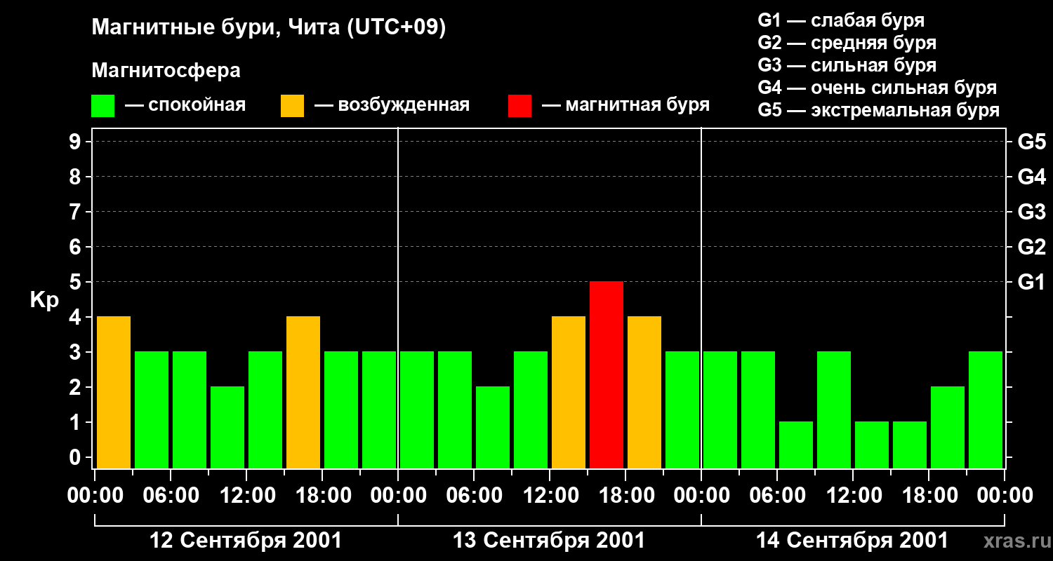 Изменения геомагнитного индекса Kp с 12 по 14 сентября 2001 года для средних широт