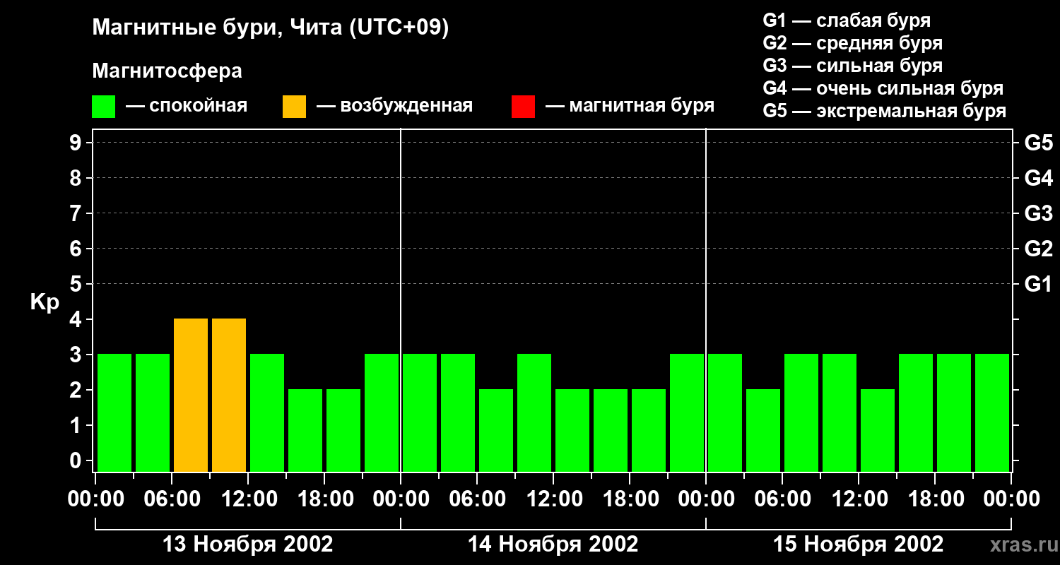 Изменения геомагнитного индекса Kp с 13 по 15 ноября 2002 года для средних широт