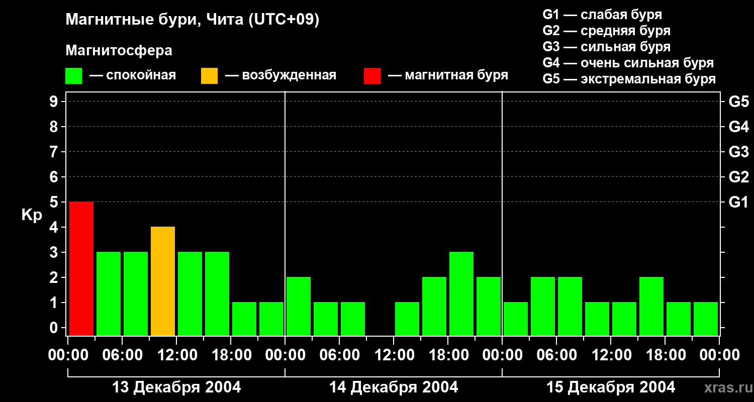 Изменения геомагнитного индекса Kp с 13 по 15 декабря 2004 года для средних широт