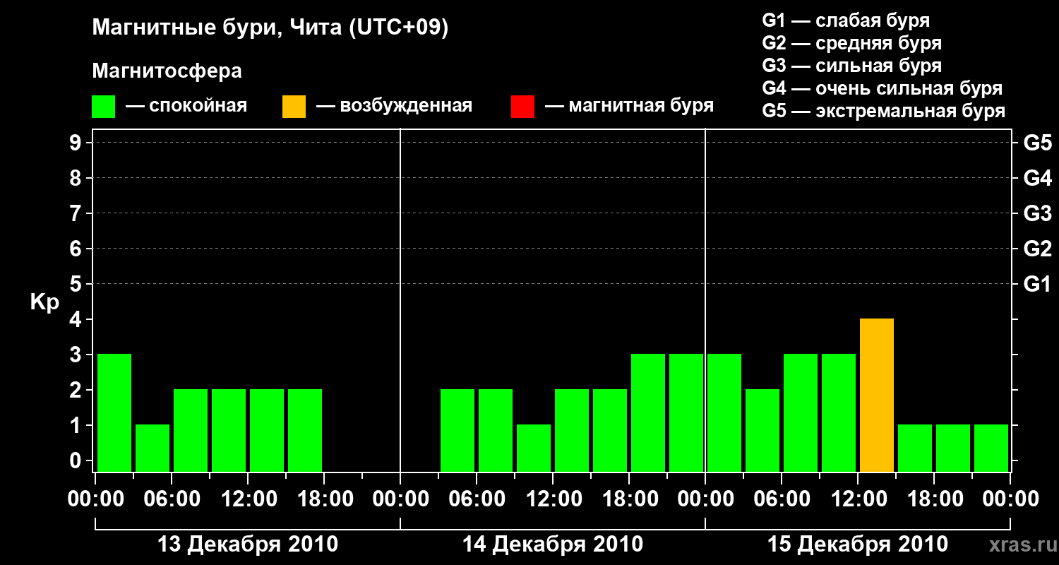 Изменения геомагнитного индекса Kp с 13 по 15 декабря 2010 года для средних широт