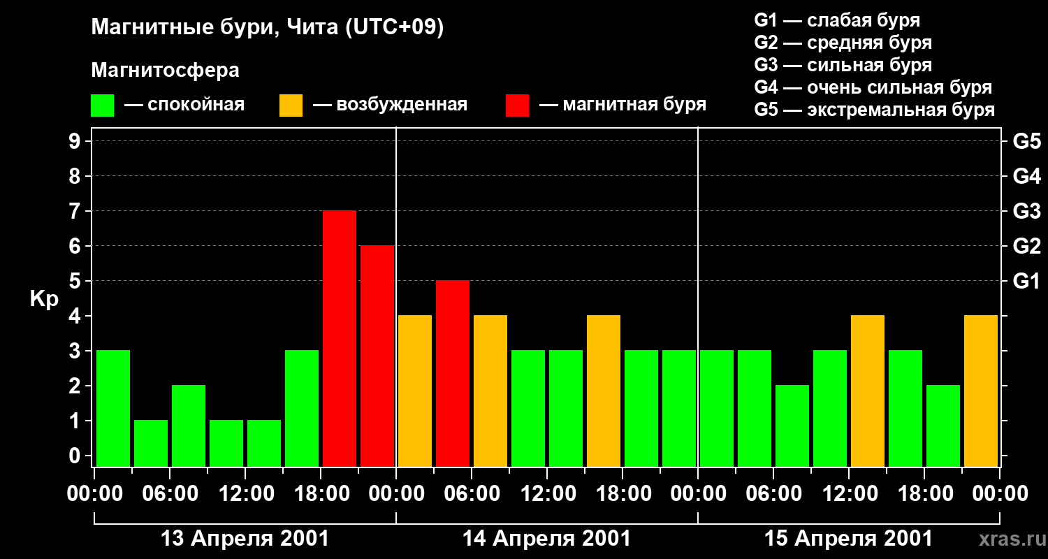 Изменения геомагнитного индекса Kp с 13 по 15 апреля 2001 года для средних широт