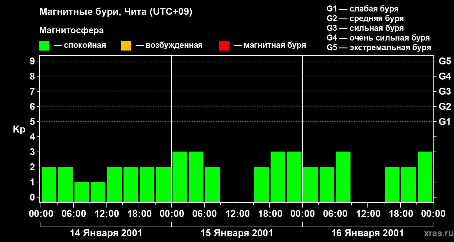 Изменения геомагнитного индекса Kp с 14 по 16 января 2001 года для средних широт