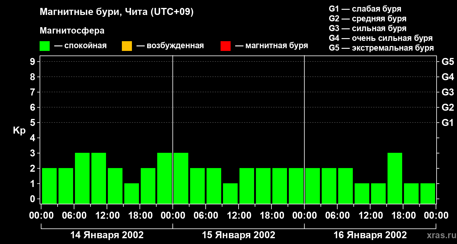Изменения геомагнитного индекса Kp с 14 по 16 января 2002 года для средних широт