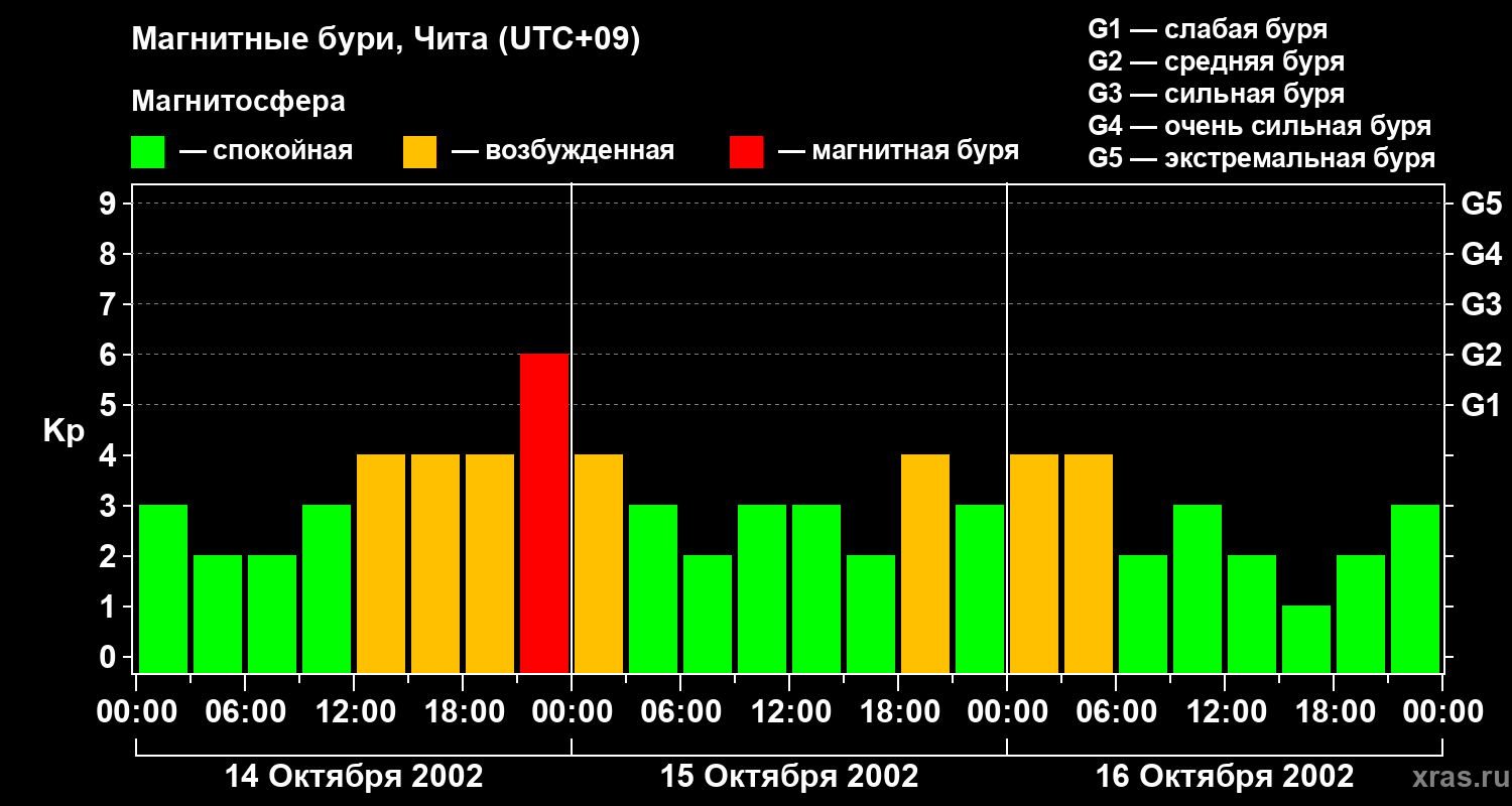 Изменения геомагнитного индекса Kp с 14 по 16 октября 2002 года для средних широт