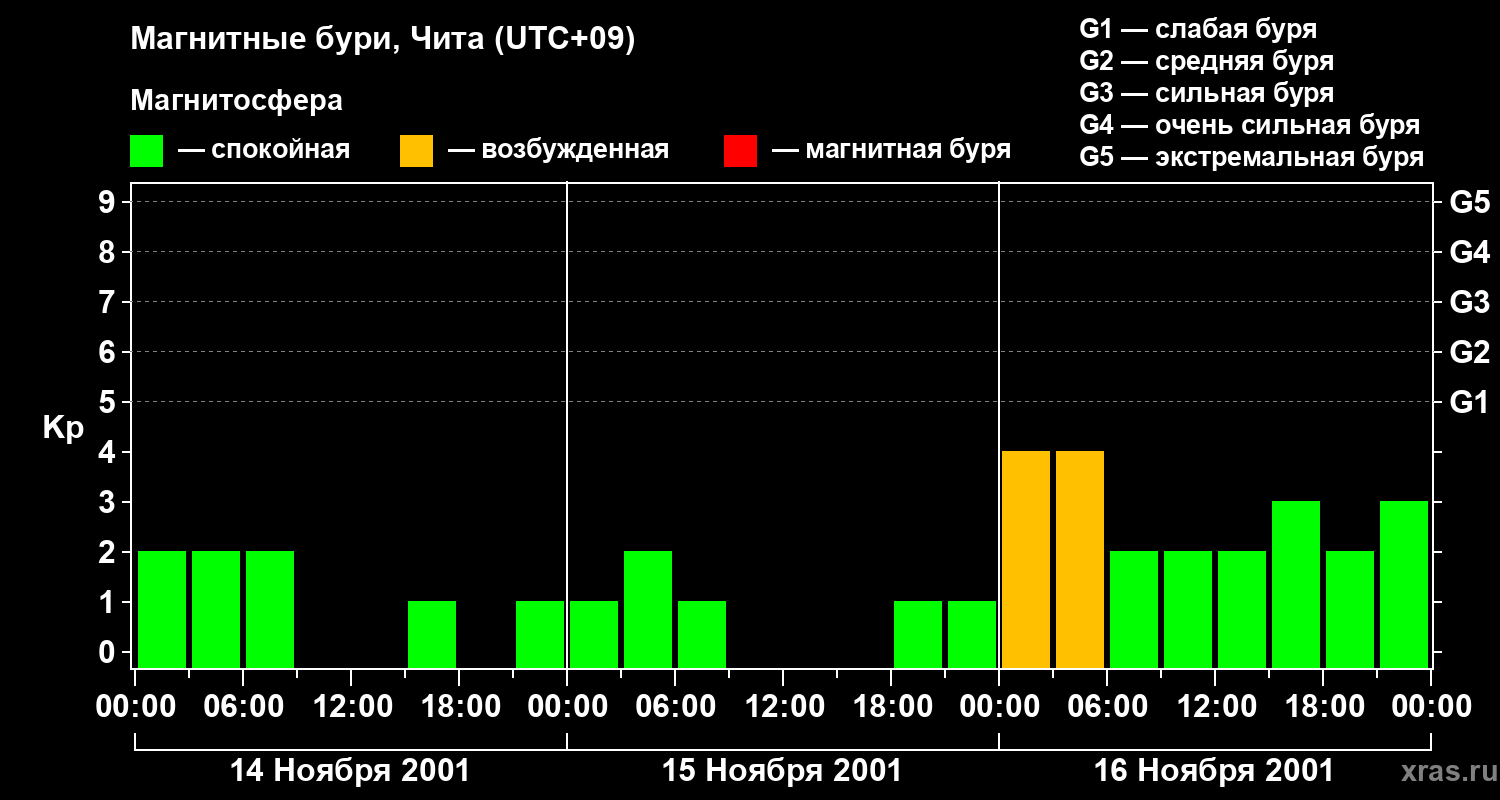 Изменения геомагнитного индекса Kp с 14 по 16 ноября 2001 года для средних широт