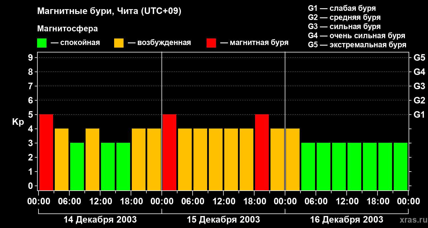 Изменения геомагнитного индекса Kp с 14 по 16 декабря 2003 года для средних широт