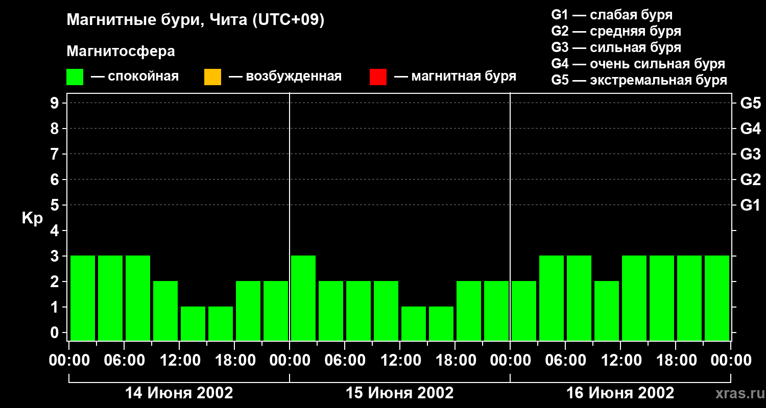 Изменения геомагнитного индекса Kp с 14 по 16 июня 2002 года для средних широт
