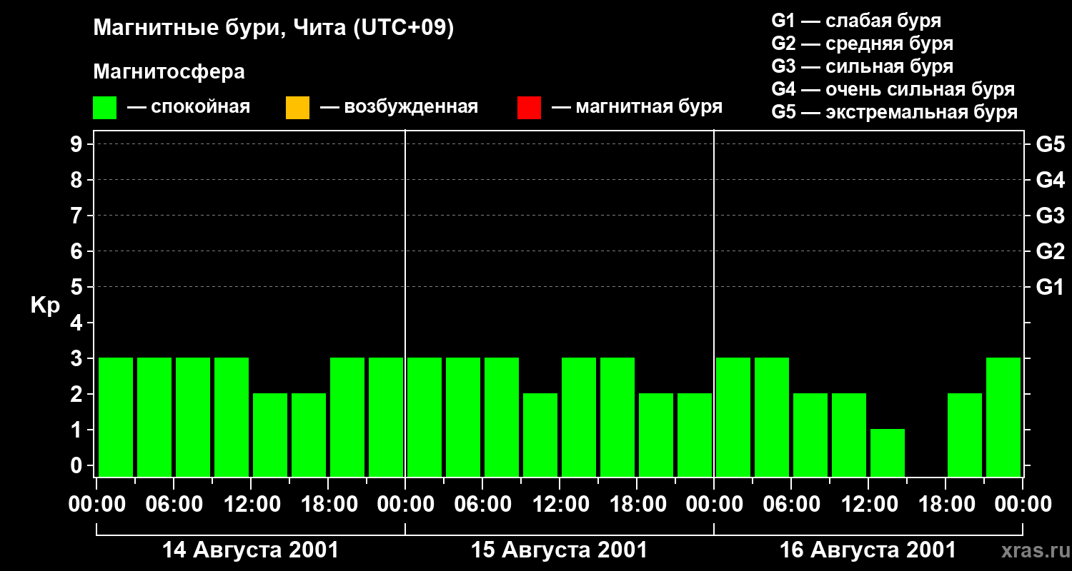 Изменения геомагнитного индекса Kp с 14 по 16 августа 2001 года для средних широт