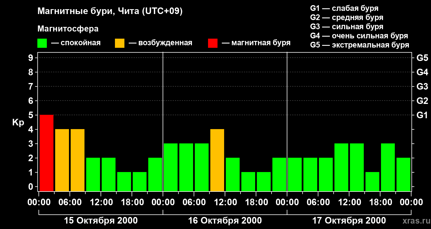 Изменения геомагнитного индекса Kp с 15 по 17 октября 2000 года для средних широт
