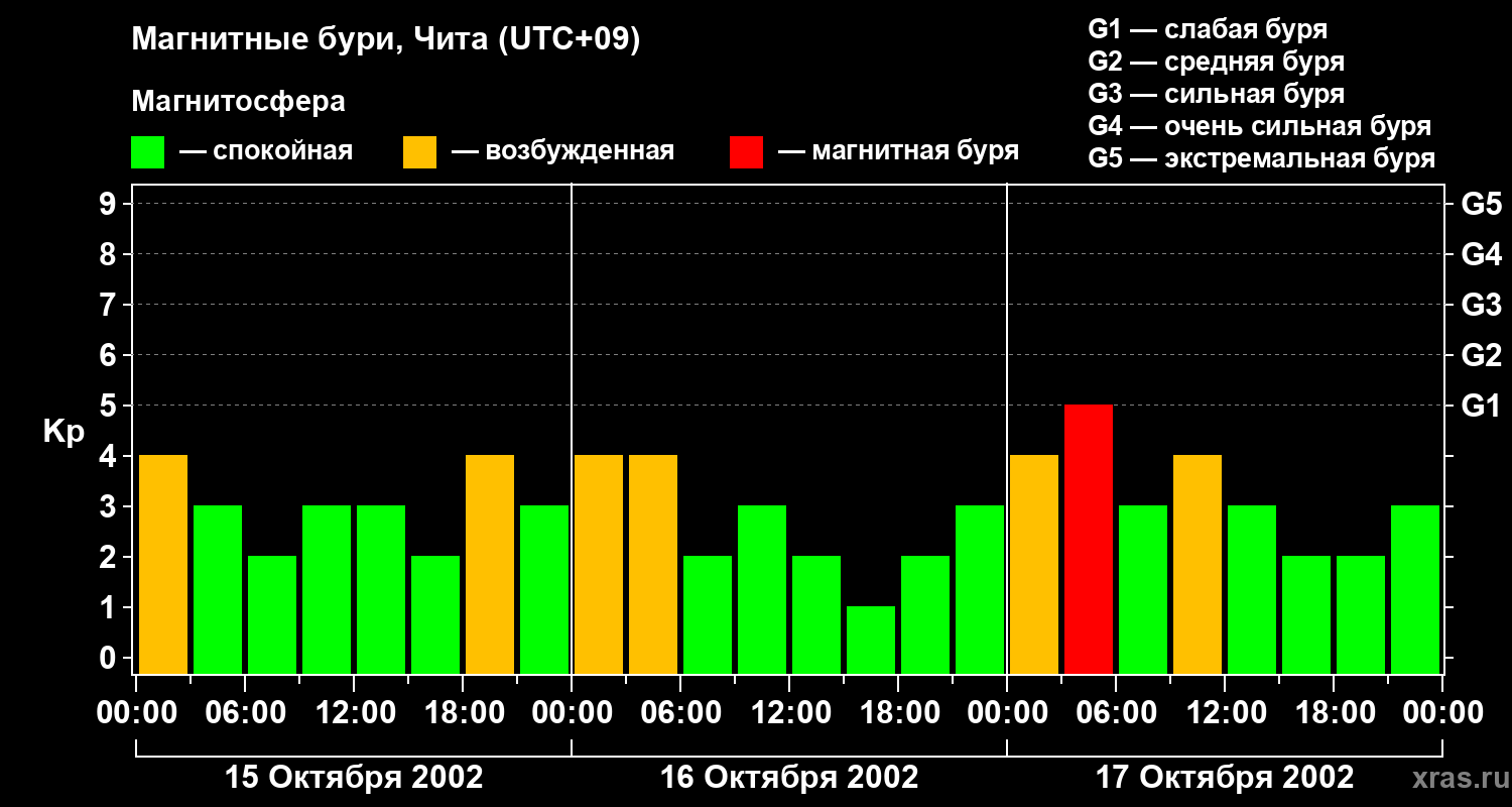 Изменения геомагнитного индекса Kp с 15 по 17 октября 2002 года для средних широт