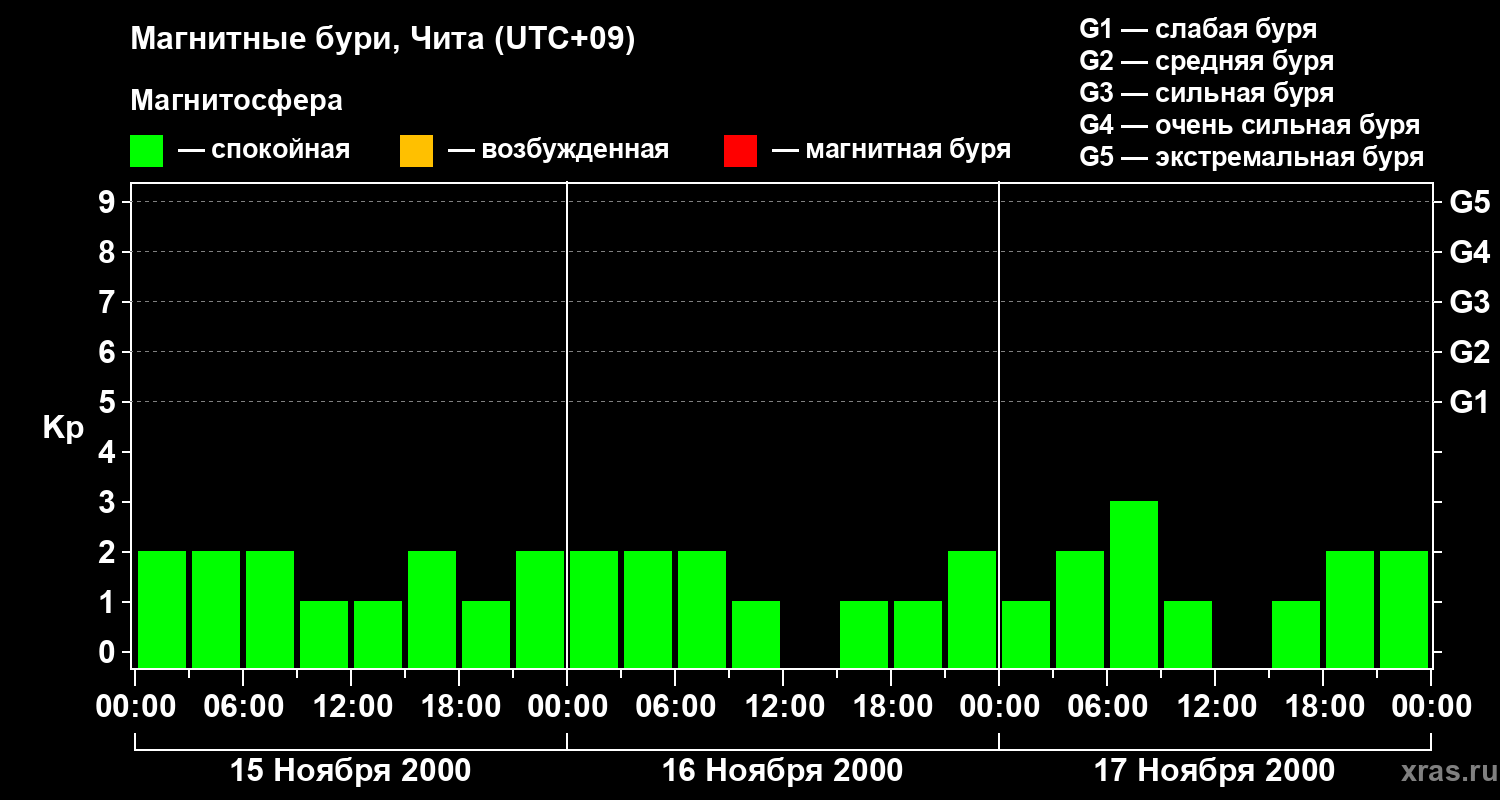 Изменения геомагнитного индекса Kp с 15 по 17 ноября 2000 года для средних широт