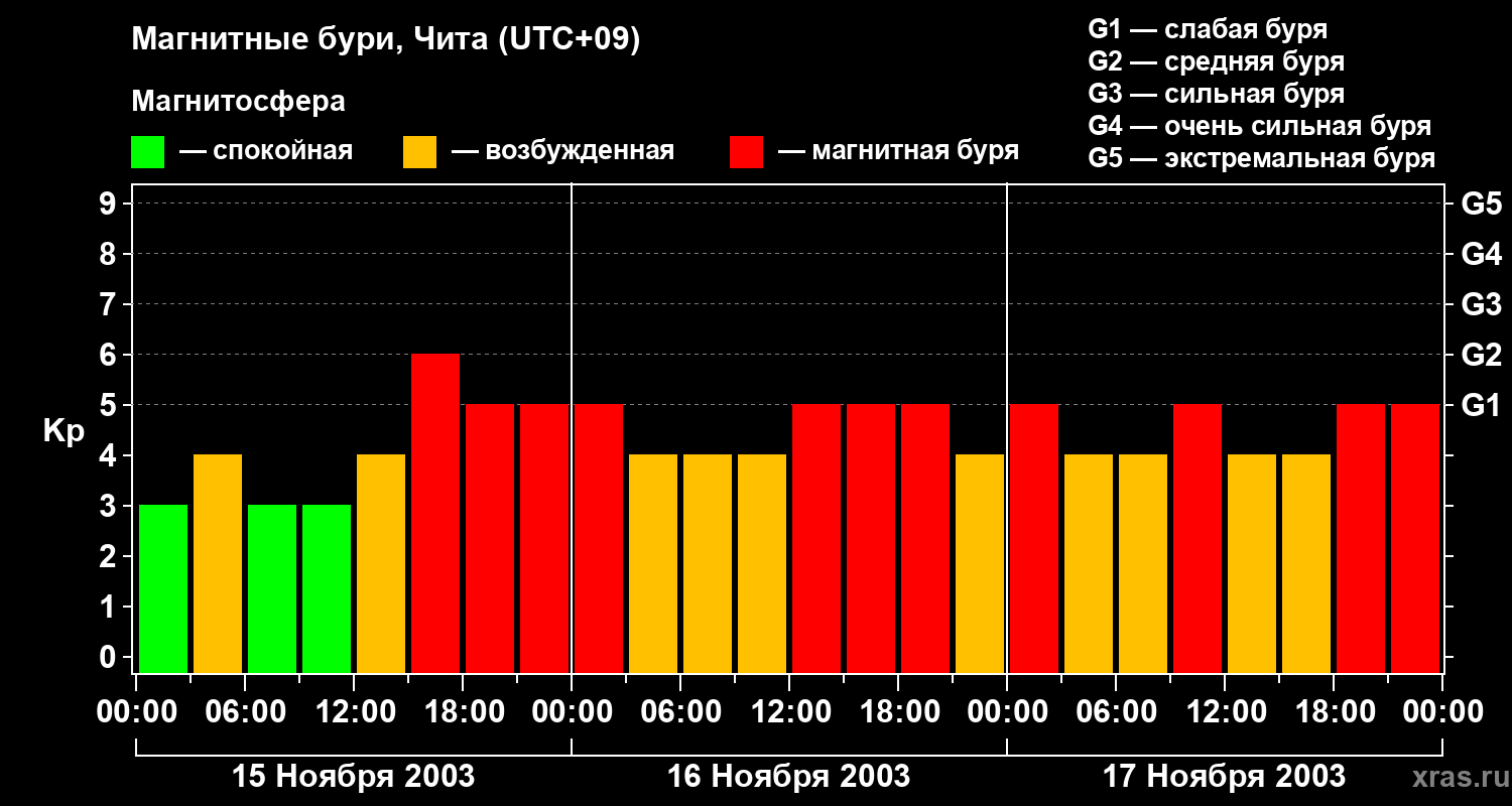 Изменения геомагнитного индекса Kp с 15 по 17 ноября 2003 года для средних широт