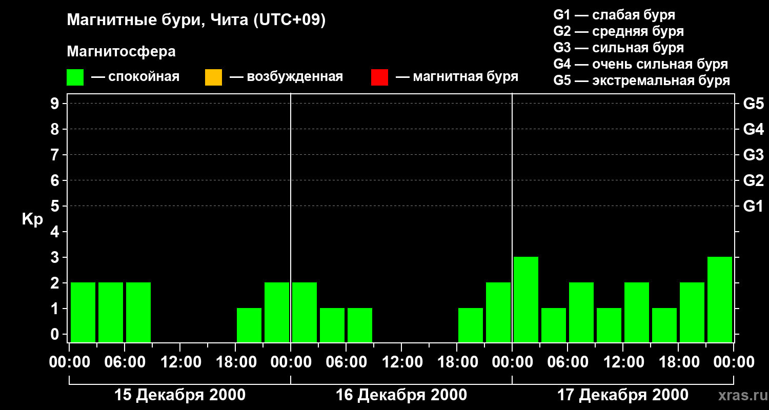 Изменения геомагнитного индекса Kp с 15 по 17 декабря 2000 года для средних широт