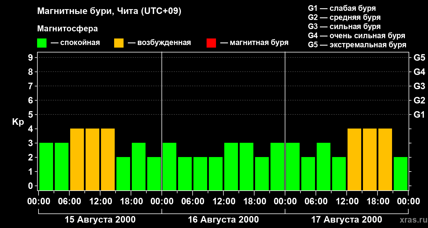 Изменения геомагнитного индекса Kp с 15 по 17 августа 2000 года для средних широт