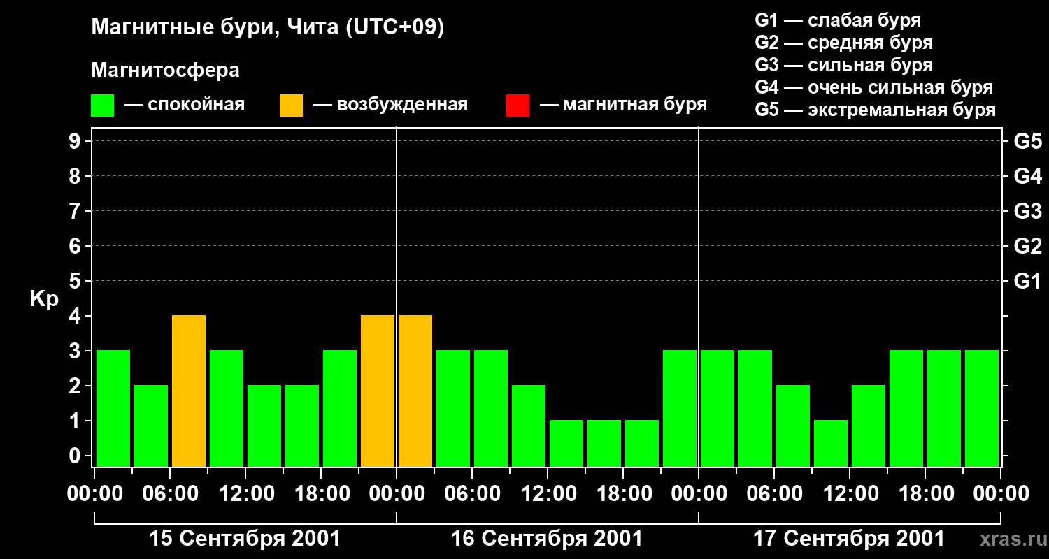 Изменения геомагнитного индекса Kp с 15 по 17 сентября 2001 года для средних широт