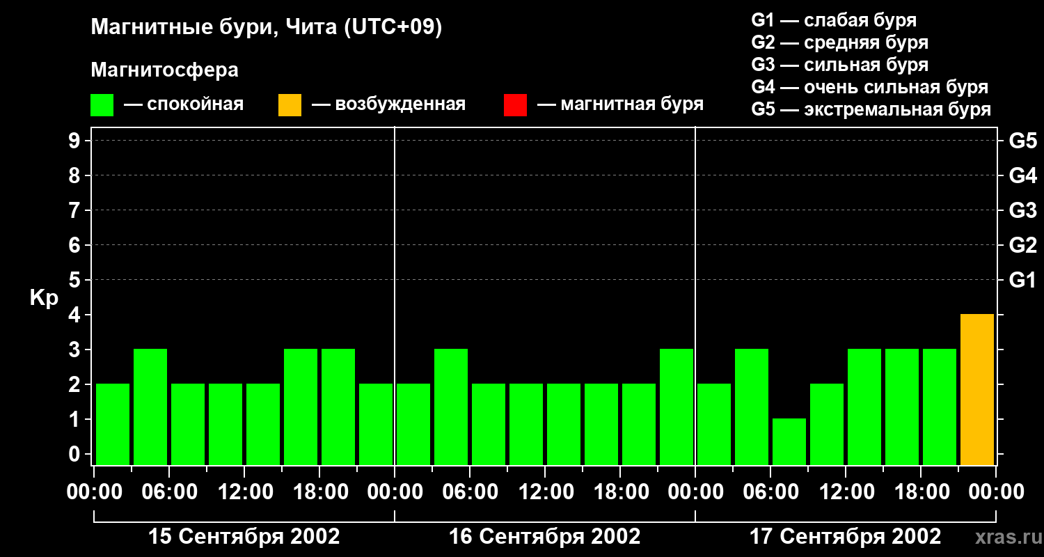 Изменения геомагнитного индекса Kp с 15 по 17 сентября 2002 года для средних широт