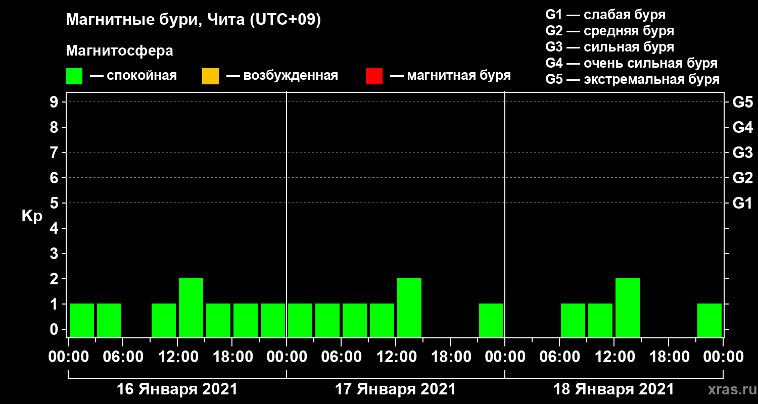 Изменения геомагнитного индекса Kp с 16 по 18 января 2021 года для средних широт