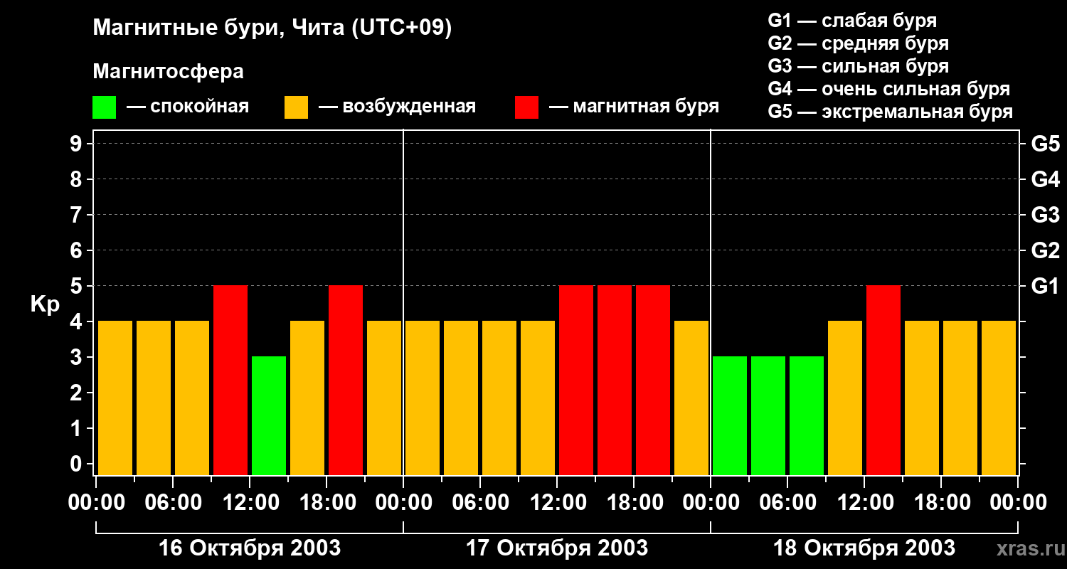 Изменения геомагнитного индекса Kp с 16 по 18 октября 2003 года для средних широт