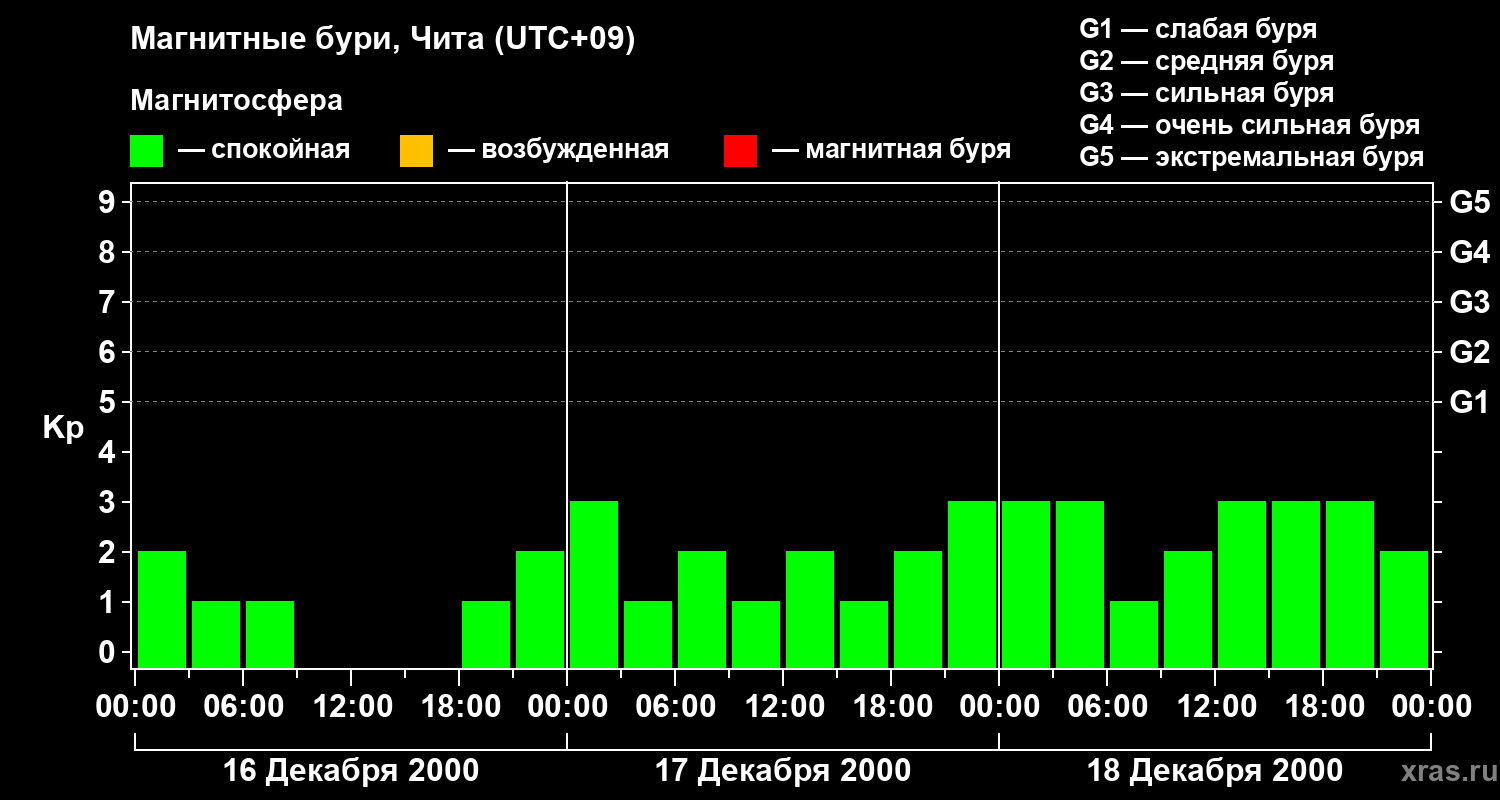 Изменения геомагнитного индекса Kp с 16 по 18 декабря 2000 года для средних широт