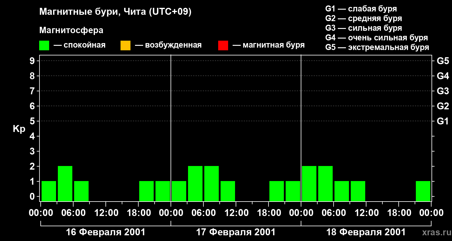 Изменения геомагнитного индекса Kp с 16 по 18 февраля 2001 года для средних широт