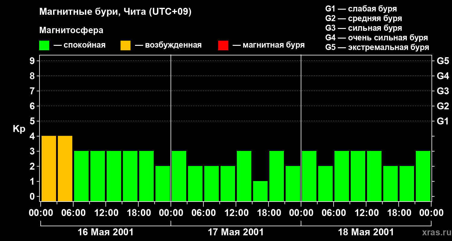 Изменения геомагнитного индекса Kp с 16 по 18 мая 2001 года для средних широт