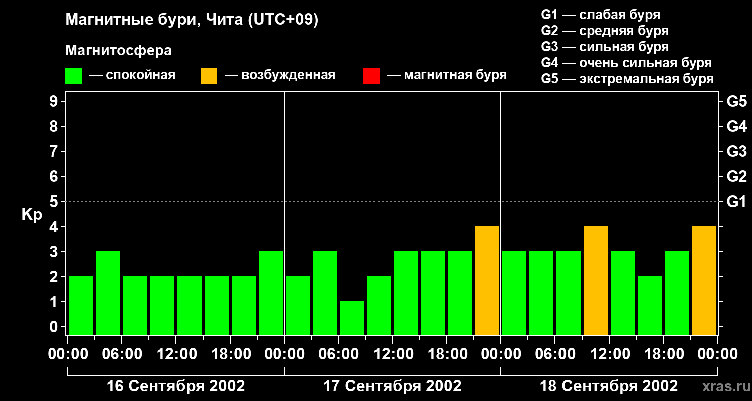 Изменения геомагнитного индекса Kp с 16 по 18 сентября 2002 года для средних широт