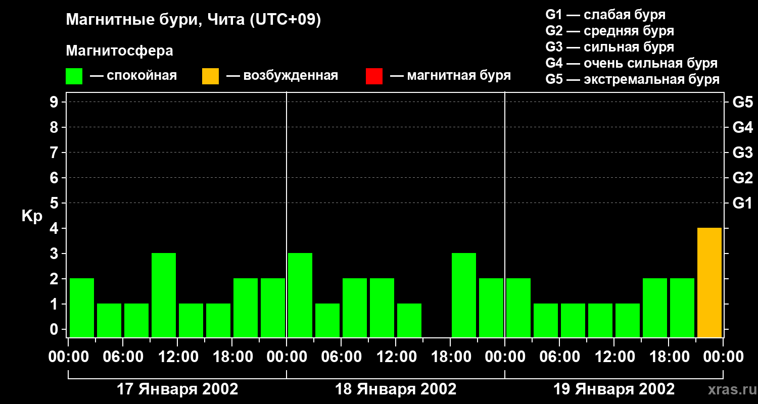 Изменения геомагнитного индекса Kp с 17 по 19 января 2002 года для средних широт