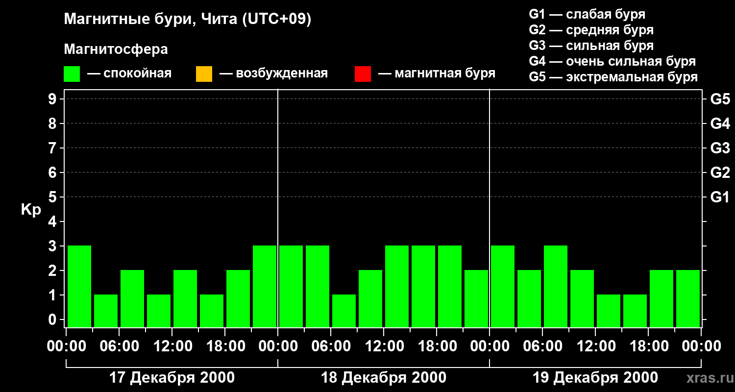 Изменения геомагнитного индекса Kp с 17 по 19 декабря 2000 года для средних широт