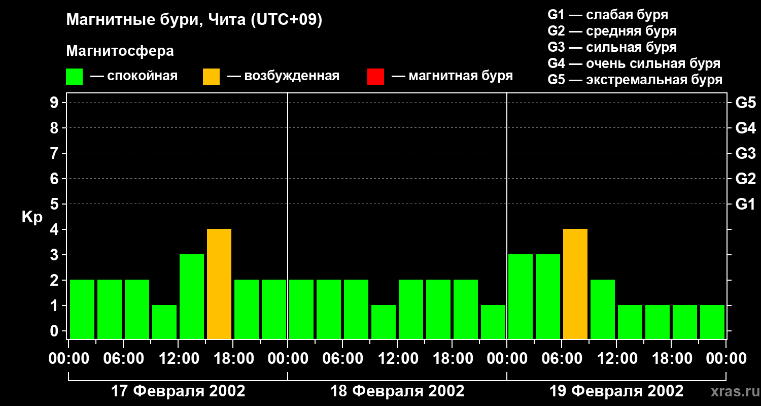 Изменения геомагнитного индекса Kp с 17 по 19 февраля 2002 года для средних широт