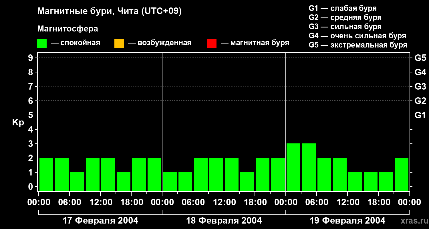 Изменения геомагнитного индекса Kp с 17 по 19 февраля 2004 года для средних широт