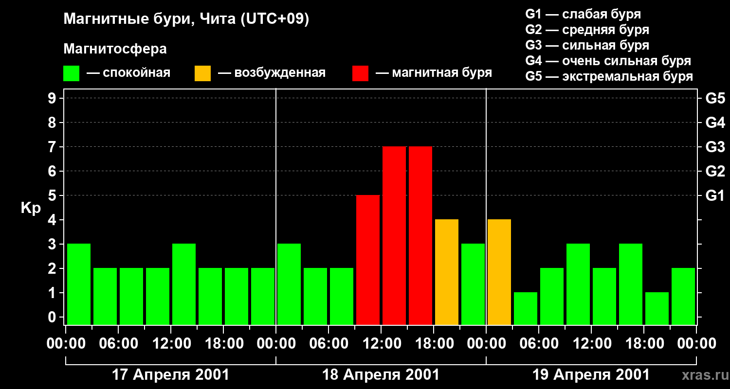 Изменения геомагнитного индекса Kp с 17 по 19 апреля 2001 года для средних широт