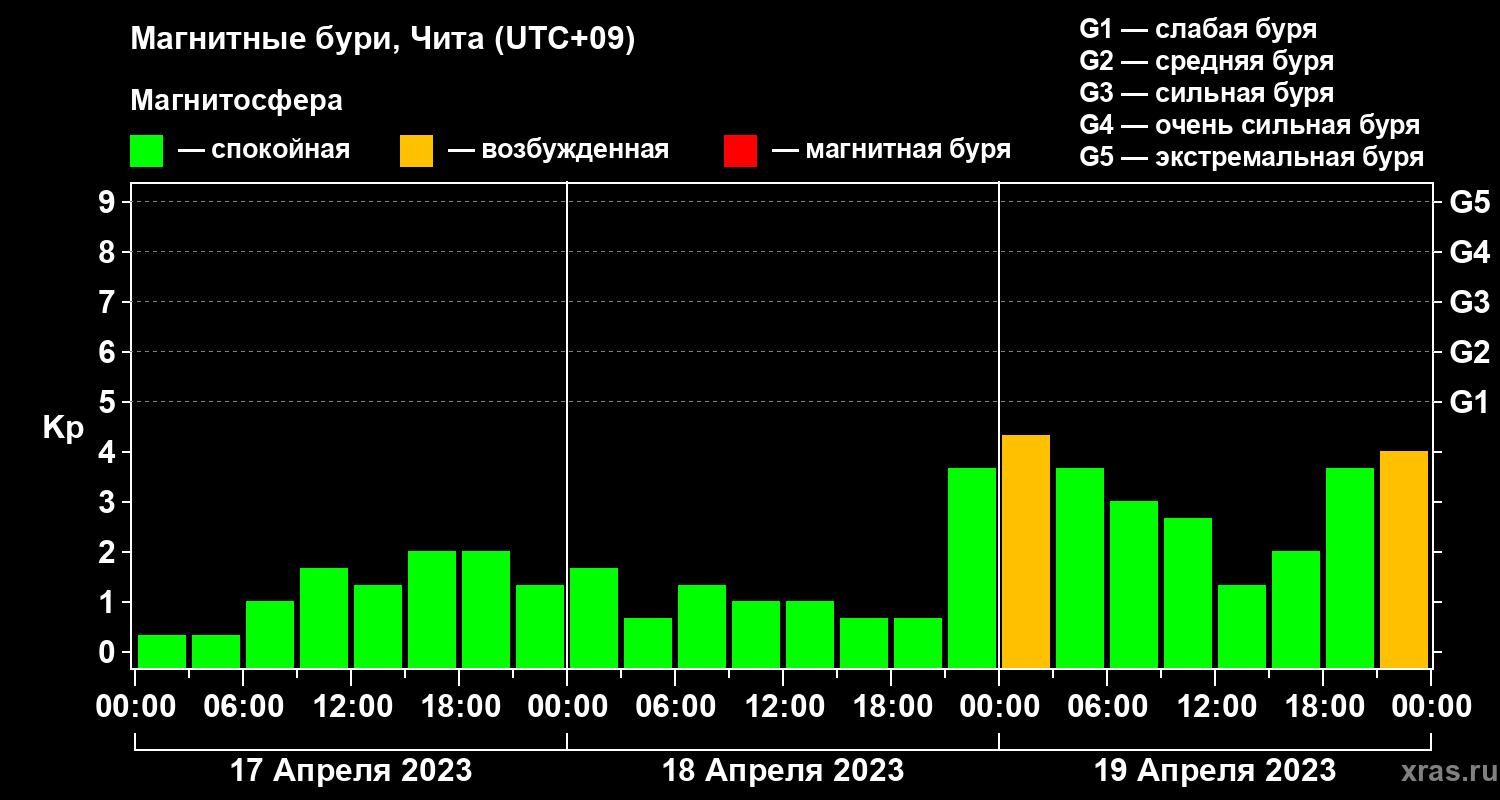 Изменения геомагнитного индекса Kp с 17 по 19 апреля 2023 года для средних широт