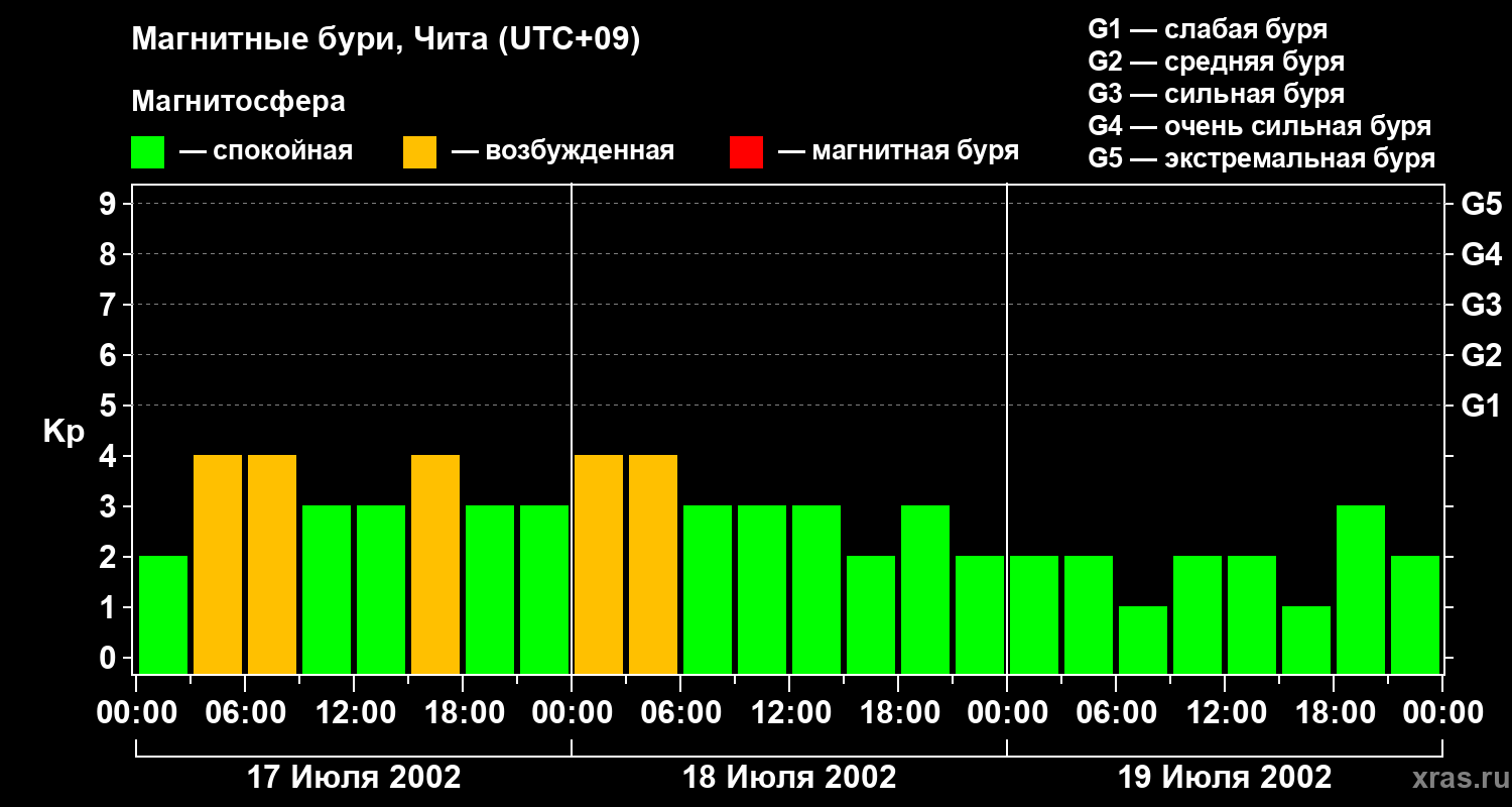 Изменения геомагнитного индекса Kp с 17 по 19 июля 2002 года для средних широт