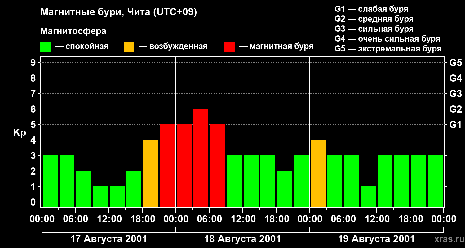 Изменения геомагнитного индекса Kp с 17 по 19 августа 2001 года для средних широт